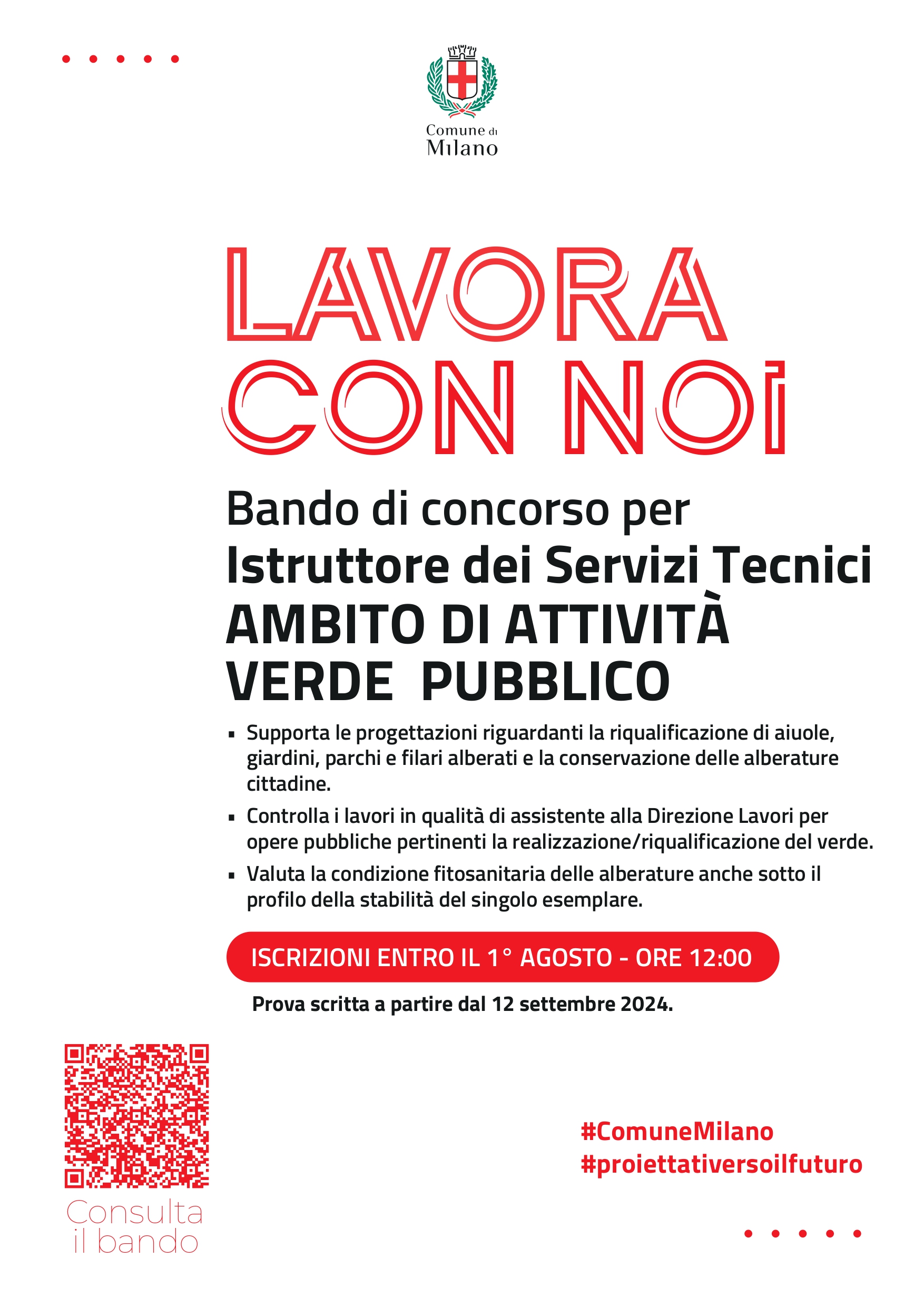 In data 2 luglio 2024 è stato pubblicato sul sito del Comune di Milano e sul portale di reclutamento inPA, il bando relativo alla SELEZIONE PUBBLICA, PER ESAMI, PER LA COPERTURA DI N. 3 POSTI A TEMPO INDETERMINATO DEL PROFILO PROFESSIONALE DI ISTRUTTORE DEI SERVIZI TECNICI – AMBITO DI ATTIVITÀ VERDE PUBBLICO – AREA DEGLI ISTRUTTORI